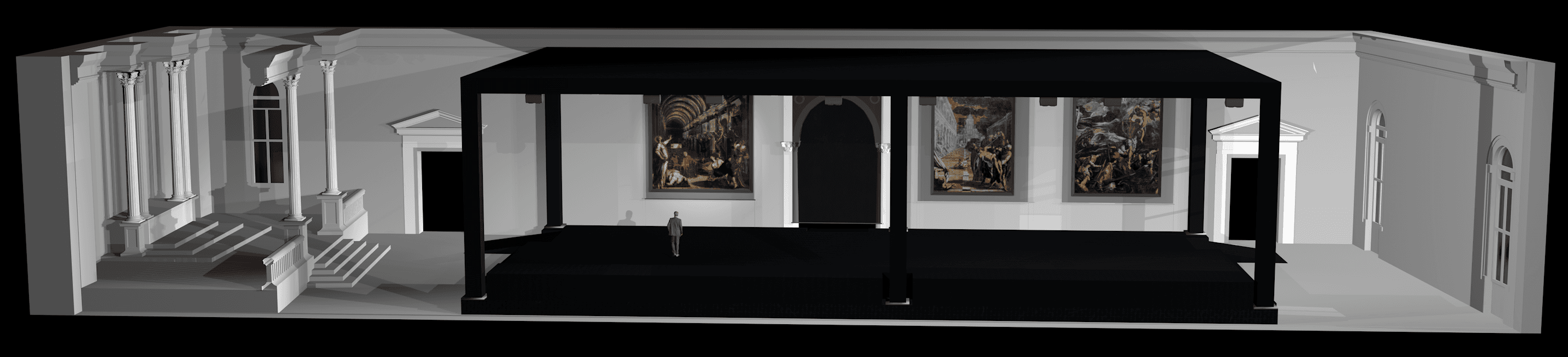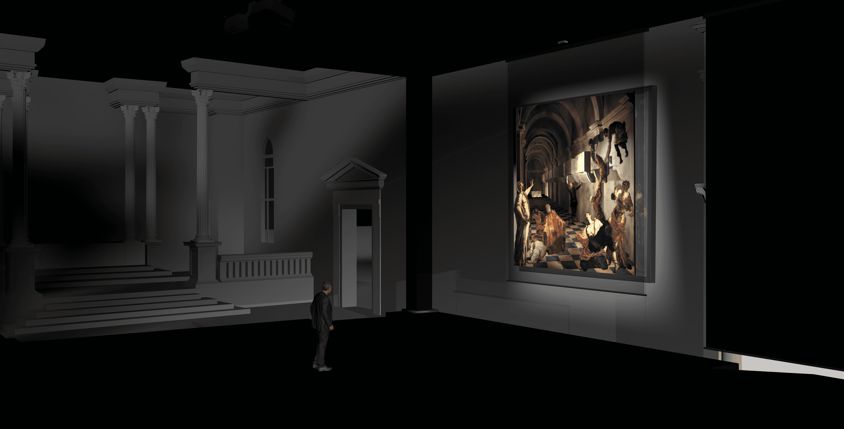 An interactive video-mapping installation that reimagines Tintoretto’s paintings in their original setting through 3D projections and guided narration, creating a dynamic dialogue between the artwork and the visitor by revealing each painting’s technical, spatial, and formal layers.